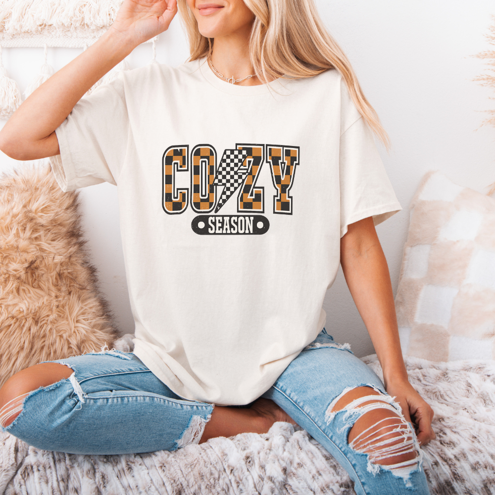 Wrap yourself in all the fall feels with our Cozy Season tee. Featuring bold, playful lettering with a pop of checkerboard flair, this shirt is the perfect mix of comfort and style. Whether you’re sipping pumpkin spice, curled up with a blanket, or out enjoying crisp autumn air, this soft cotton tee is made for snuggly vibes all season long.