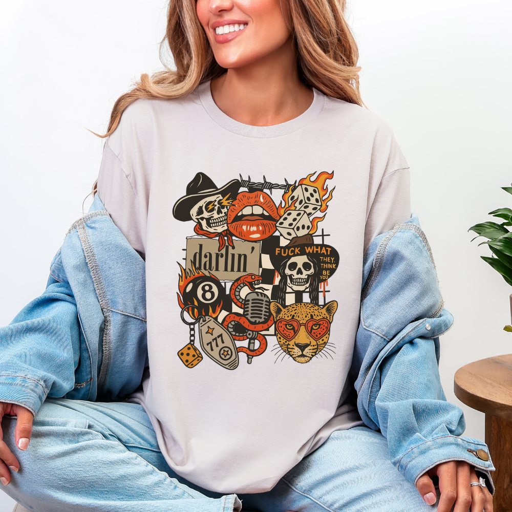 Bold. Edgy. Unapologetic. This tattoo-inspired graphic tee brings together fiery dice, skulls, lips, and a fierce big cat for the ultimate statement piece. With pops of flame, western vibes, and rock ‘n roll attitude, it’s basically wearable rebellion.